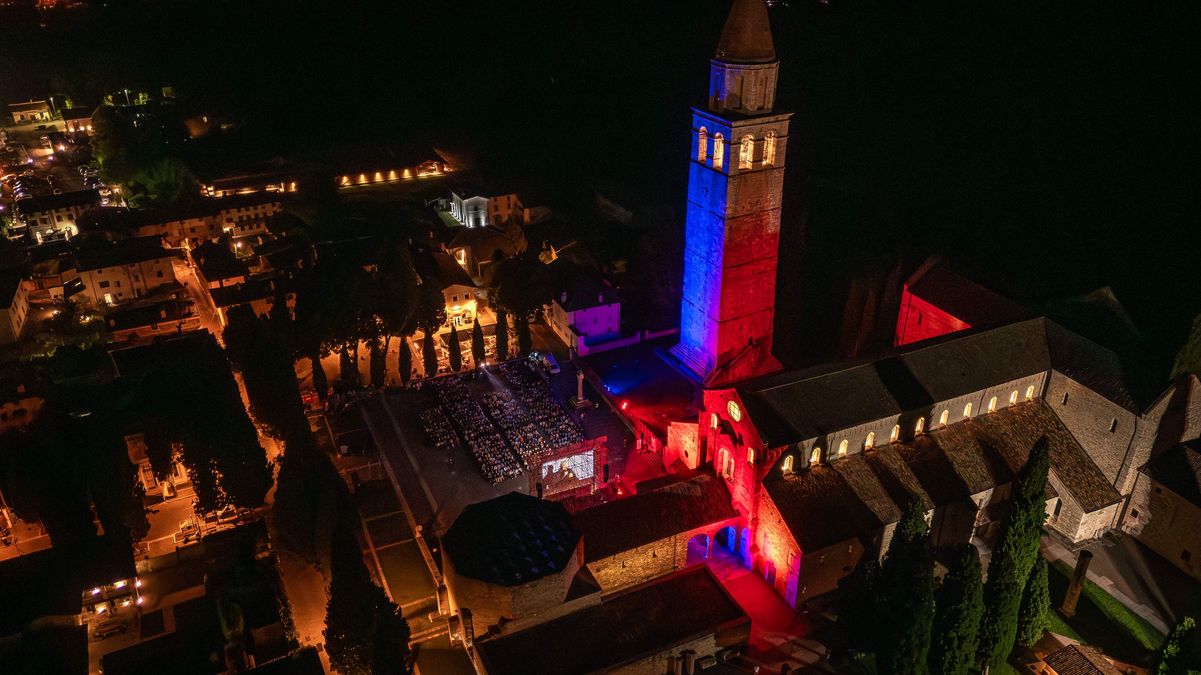 Aquileia Film Festival: suggestiva panoramica di piazza Capitolo gremita vista da drone (foto n.oleotto / fondazione aquileia)
