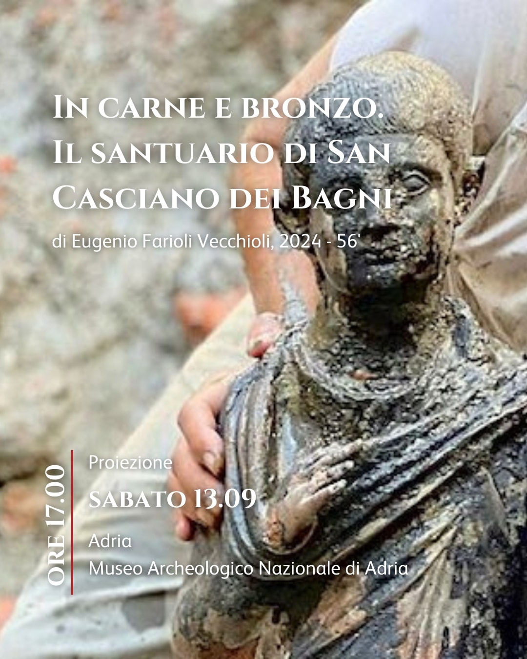 Il film “In carne e bronzo. Il santuario di San Casciano dei Bagni” (Italia 2025), che segue quello del 2023 “Come un fulmine nell’acqua. I bronzi di San Casciano dei Bagni” che alla 35.ma edizione del RAM film festival di Rovereto, nell’ottobre 2024, ha fatto il pieno di consensi, racconta le nuove scoperte e i nuovi filoni della ricerca, sempre più interdisciplinare, che sta ricostruendo con sempre maggiori dettagli il passato sacro di questo meraviglioso paesaggio termale, a partire dalle nuove statue in bronzo: dai corpi femminili e maschili, tra cui una bellissima figura in preghiera, alcuni lasciati come dono nella loro metà esatta, fusa con la precisione di un taglio chirurgico, agli animali, come una serie di serpenti bronzei di forme e dimensioni diverse, come un serpente barbuto e crestato, lungo quasi un metro. È quello che gli antichi chiamavano agatodèmone, lo spirito buono e profetico della sorgente incarnato in un corpo di rettile. Non solo oggetti in bronzo, ma anche dei preziosissimi materiali organici perfettamente conservati. Centinaia di uova deposte nell’acqua. E ritrovate nel fango. Alcune intatte. Ciò che di più raro possa emergere da uno scavo, segno tangibile di un dono che forse allude anch’esso alle capacità generatrici della vasca sacra (vedi San Casciano dei Bagni (Si). Rai Cultura presenta in anteprima il trailer del film “Oltre il bronzo, lo scavo di San Casciano dei Bagni” di Brigida Gullo ed Eugenio Farioli Vecchioli, seconda puntata di “Italia, Viaggio nella Bellezza” con gli eccezionali risultati della campagna 2024: dal serpente agatodemone in bronzo alle uova di gallina, dagli ex voto in foglia d’oro alle statue in bronzo, dalle monete alle iscrizioni etrusche e latine | archeologiavocidalpassato).
