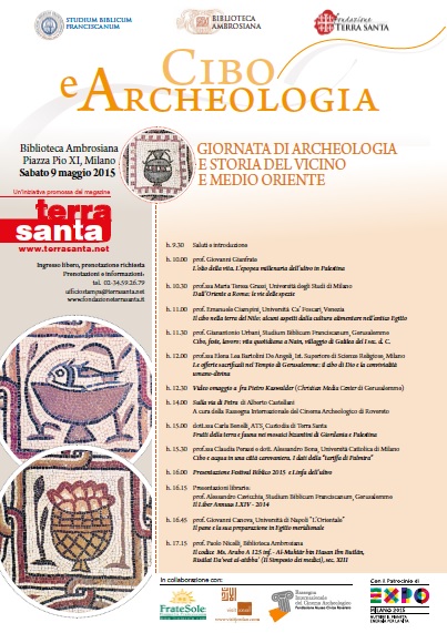 Intenso il programma della giornata scandita dagli interventi di professori universitari provenienti da cinque atenei: l’Università degli Studi e la Cattolica di Milano, L’Orientale di Napoli, l’Università Ca’ Foscari di Venezia e lo Studium Biblicum di Gerusalemme. Si inizia alle 9.30, saluti e introduzione; 10, prof. Giovanni Gianfrate su “L’olio della vita. L’epopea millenaria dell’ulivo in Palestina”; 10.30, prof.ssa Maria Teresa Grassi, Università degli Studi di Milano, su “Dall’Oriente a Roma: le vie delle spezie”; 11, prof. Emanuele Ciampini, Università Ca’ Foscari, Venezia, su “Il cibo nella terra del Nilo: alcuni aspetti dalla cultura alimentare nell’antico Egitto”; 11.30, prof. Gianantonio Urbani, Studium Biblicum Franciscanum, Gerusalemme, su “Cibo, feste, lavoro: vita quotidiana a Nain, villaggio di Galilea del I sec. d.C”; 12, prof.ssa Elena Lea Bartolini De Angeli, Ist. Superiore di Scienze Religiose, Milano, su “Le offerte sacrificali nel Tempio di Gerusalemme: il cibo di Dio e la convivialità umano-divina”; 12.30, Video omaggio a fra Pietro Kaswalder (Christian Media Center di Gerusalemme); 14, “Sulla via di Petra” film di Alberto Castellani (vedi archeologiavocidalpassato https://archeologiavocidalpassato.wordpress.com/2013/11/28/a-bologna-petra-inedita-nel-film-di-castellani/), a cura della Rassegna Internazionale del Cinema Archeologico di Rovereto; 15, Carla Benelli, ATS, Custodia di Terra Santa, su “Frutti della terra e fauna nei mosaici bizantini di Giordania e Palestina”; 15.30, prof.ssa Claudia Perassi e dott. Alessandro Bona, Università Cattolica di Milano, su “Cibo e acqua in una città carovaniera. I dati della ‘tariffa di Palmira’”; 16, Presentazione Festival Biblico 2015 e Linfa dell’ulivo; 16.15, prof. Alessandro Cavicchia, Studium Biblicum Franciscanum, Gerusalemme, presenta il libro “Il Liber Annuus LXIV – 2014”; 16.45, prof. Giovanni Canova, Università di Napoli “L’Orientale”, su “Il pane e la sua preparazione in Egitto meridionale”; 17.15 prof. Paolo Nicelli, Biblioteca Ambrosiana, su “Il codice Ms. Arabo A 125 inf. – Al-Muhtār bin Hasan Ibn Butlān, Risālat Da‛wat al-atibba’ (Il Simposio dei medici), sec. XIII”.