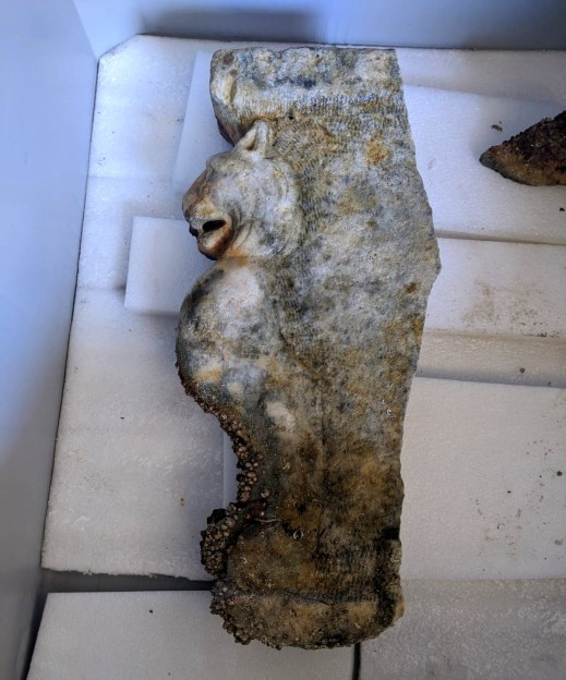 Parco sommerso di Baia: i tecnici del parco archeologico dei Campi Flegrei hanno scoperto un trapezoforo: un sostegno per tavolo in marmo decorato con testa felina. Sarà esposto al museo Archeologico del Castello di Baia