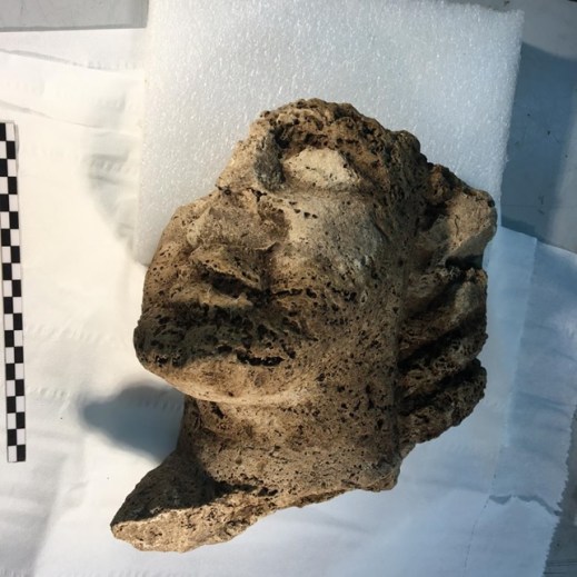 Il frammento di testa tardo-arcaica in pietra scoperto nel santuario di Athena a Paestum dagli archeologi dell’università di Salerno (foto parco archeologico di Paestum)