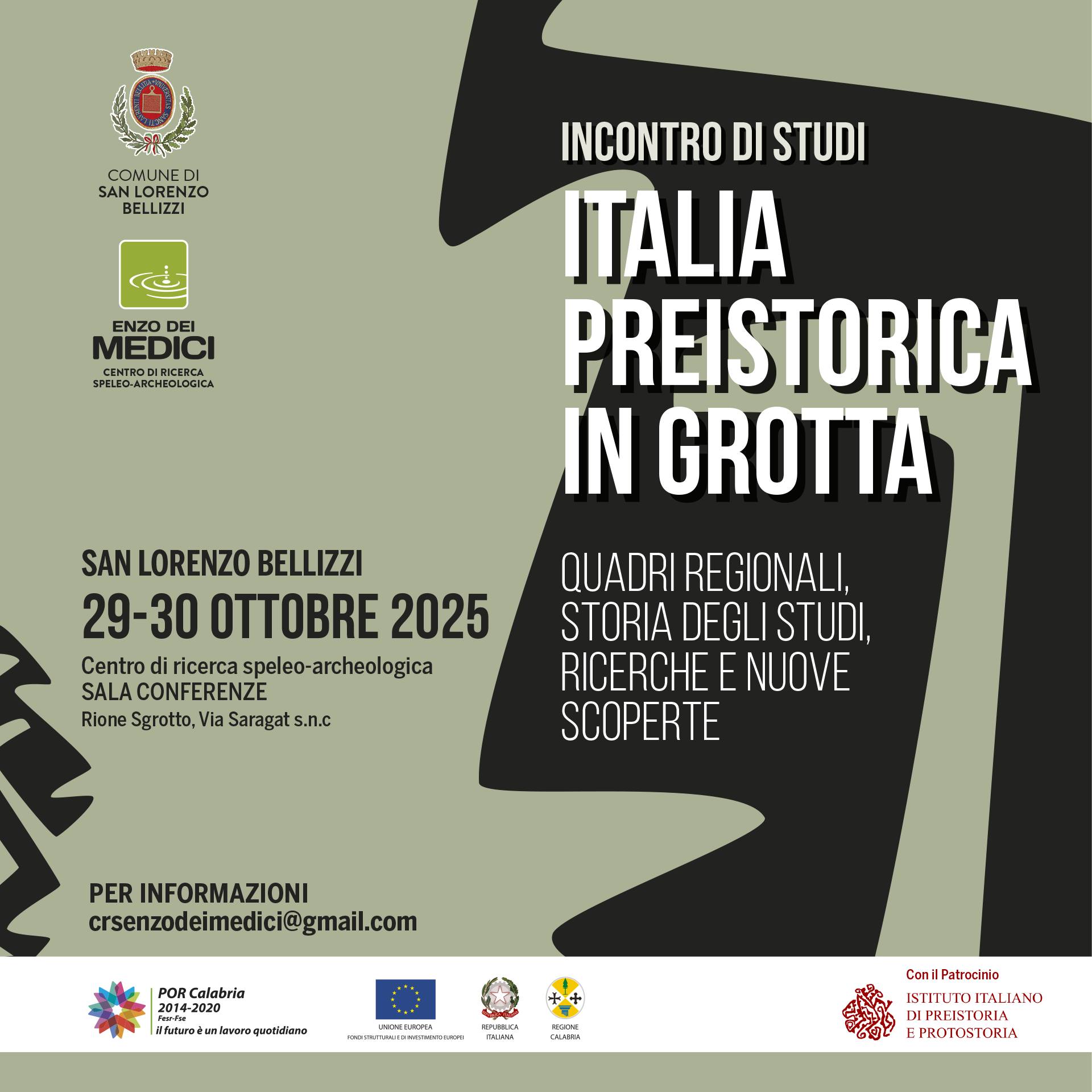 Il 29 e 30 ottobre 2025 a San Lorenzo Bellizzi (Cs) si tiene l’incontro di studi “Italia preistorica in grotta. Quadri regionali, storia degli studi, ricerche e nuove scoperte”, patrocinato dall’Istituto Italiano di Preistoria e Protostoria di Firenze, con la presentazione di vari contributi scientifici su ricerche e studi riguardanti le frequentazioni umane pre-protostoriche delle cavità naturali di diverse regioni italiane, da Nord a Sud. L’incontro sarà introdotto dai saluti del sindaco di San Lorenzo Bellizzi, Antonio Cersosimo; del soprintendente Archeologia Belle arti e Paesaggio per la provincia di Cosenza, Paola Aurino; del direttore dell’Istituto Centrale per l’Archeologia – ministero della Cultura, Mirella Serlorenzi; del presidente del Centro di ricerca speleo-archeologica “Enzo dei Medici”, Felice Larocca. Nella giornata successiva, 31 ottobre 2025, sarà possibile partecipare a visite guidate in alcuni siti preistorici sotterranei del territorio, come la Grotta di Pietra Sant’Angelo a San Lorenzo Bellizzi, le Grotte di Sant’Angelo a Cassano allo Ionio, la Grotta della Monaca a Sant’Agata di Esaro.
