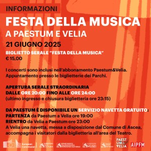 Due modi diversi, ma complementari, di far dialogare il patrimonio con i linguaggi del contemporaneo. Biglietto serale “Festa della Musica” 15 euro. I concerti sono inclusi nell’abbonamento Paestum&Velia. Appuntamento alle biglietterie dei Parchi. Apertura serale straordinaria dalle 20 fino a mezzanotte (ultimo ingresso e chiusura biglietteria ore 23.15). Da Paestum è disponibile un servizio navetta gratuito: partenza da Paestum a Velia ore 19, rientro da Velia a Paestum ore 23. A Velia una navetta, messa a disposizione gratuitamente dai Parchi, accompagna i visitatori dalla biglietteria all’area del Teatro e un’altra navetta, messa a disposizione dal Comune di Ascea, accompagna i visitatori dalla biglietteria all’area del Teatro.