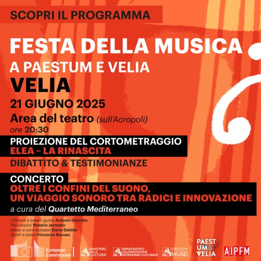 VELIA: “IL MEDITERRANEO E OLTRE. VIAGGI DI SUONI E DI PERSONE”. A Velia, la Festa della Musica diventa un viaggio culturale e sensoriale. Alle 20.30, il Teatro sull’Acropoli ospita un evento che intreccia arte e attualità, con uno sguardo aperto su storie, migrazioni e confini. A pochi giorni dalla Giornata Mondiale del Rifugiato, l’appuntamento si carica di significato, trasformando la musica e il cinema in veicoli di riflessione e racconto.