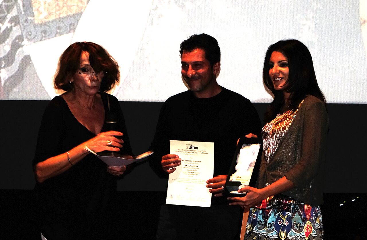 Memi Spiratou, presidente di Agon Archeological Film Festival di Atene, premia il regista Lorenzo Daniele e l’archeologa lAlessandra Cilio