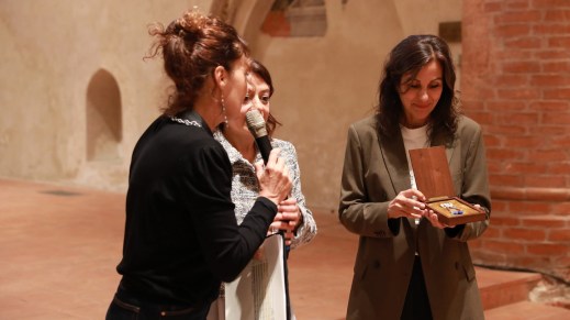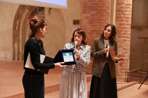 Michela Ferrero, direttrice dei Musei Civici Cuneo, col premio Cuneo Archeofilm 2025 – Scuole, tra Giulia Pruneti – a sinistra – e Cristina Clerico, assessore alla Cultura del Comune di Cuneo (foto AV)