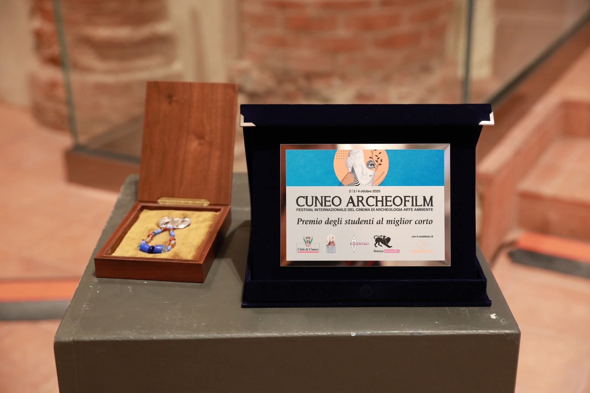 I premi assegnati nella terza edizione del Cuneo Archeofilm: da sinistra, il Premio Cuneo Archeofilm 2025 e il Premio Cune Archeofilm Scuole (foto AV)