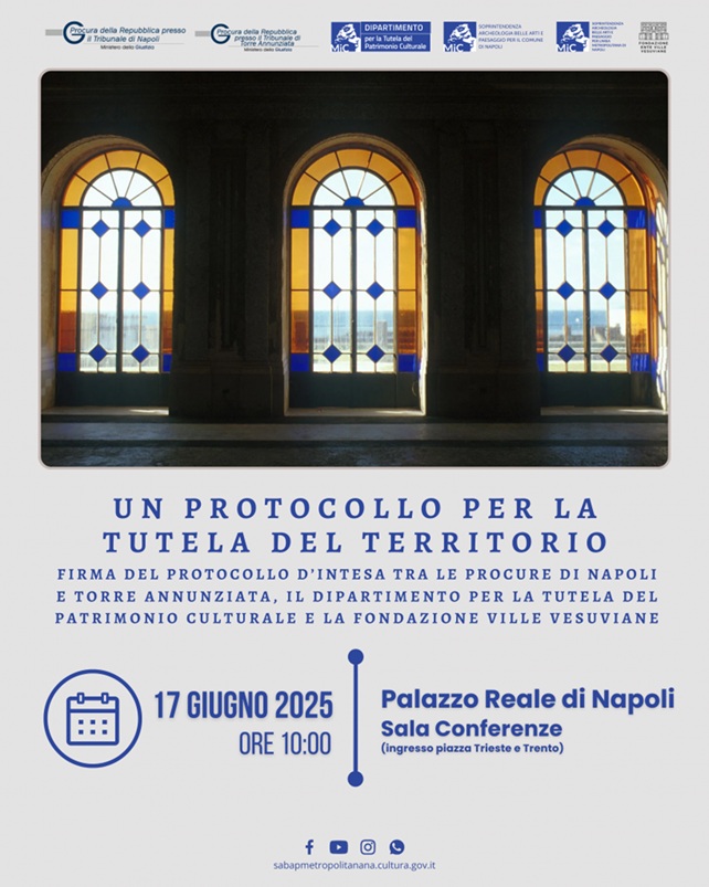 Martedì 17 giugno 2025, alle 10, nella Sala Conferenza di Palazzo Reale di Napoli, presentazione del Protocollo d’Intesa per la tutela e valorizzazione delle Ville Vesuviane. L’accordo, siglato tra la Procura della Repubblica di Napoli, la Procura della Repubblica di Torre Annunziata, il dipartimento per la Tutela del Patrimonio culturale del ministero della Cultura e la Fondazione Ente Ville Vesuviane, rappresenta un importante passo avanti nella protezione e nella promozione di un patrimonio storico-artistico di eccezionale valore. Interverranno Aldo Policastro, procuratore generale della Repubblica presso la Corte di Appello di Napoli; Nicola Gratteri, procuratore della Repubblica presso il Tribunale di Napoli; Nunzio Fragliasso, procuratore della Repubblica presso il Tribunale di Torre Annunziata; Luigi La Rocca, capo dipartimento per la tutela del patrimonio culturale – ministero della Cultura; Gennaro Miranda, presidente della Fondazione Ente Ville Vesuviane. Saranno inoltre presenti Pierpaolo Filippelli, procuratore aggiunto di Napoli; Mariano Nuzzo, soprintendente ABAP per l’area metropolitana di Napoli; Rosalia D’Apice, delegata del DG alla soprintendenza ABAP per il Comune di Napoli. Il Protocollo d’Intesa nasce dalla volontà congiunta delle istituzioni coinvolte di rafforzare gli strumenti di tutela e di valorizzazione delle Ville Vesuviane, capolavori dell’architettura settecentesca situati lungo il “Miglio d’Oro”. L’accordo mira a garantire un’azione coordinata per contrastare il degrado e l’abbandono, promuovendo al contempo iniziative culturali e di sensibilizzazione. Nel corso dell’incontro verranno illustrati gli obiettivi e le azioni concrete previste dall’accordo, tra cui la mappatura delle ville, il monitoraggio delle condizioni di rischio, la promozione di attività di restauro e conservazione e la valorizzazione attraverso eventi e percorsi culturali.