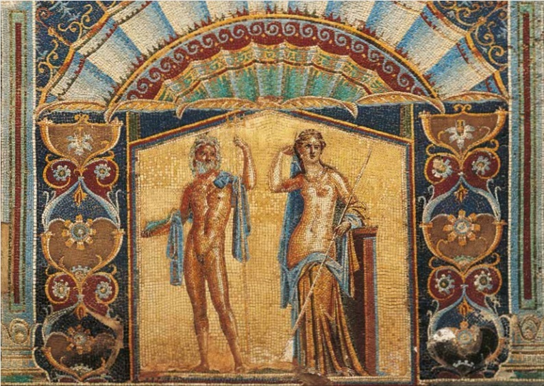 La sala più importante della Casa del Rilievo di Telefo si affacciava direttamente sul mare. “Ci si arrivava attraverso un corridoio pavimentato a mosaico”, continua Sirano, “su cui si aprivano due ambienti secondari a servizio di quello che qui avveniva. Dei grandi finestroni facevano godere della brezza e della vista sul golfo di Napoli. La sala è caratterizzata dalla presenza del marmo. È completamente rivestita di marmo alle pareti ma anche sui pavimenti. Il pavimento è costituito da lastre di marmo in forma geometrica. Si tratta di scomposizioni del tema del quadrato più volte ripetute e alternate, in marmi policromi che provengono da tutte le zone dell’Impero. Nella zona più verso il mare abbiamo anche due elementi circolari che si ritengono il luogo dove veniva appoggiata la mensa durante i banchetti ufficiali di questa casa. Le pareti presentano una decorazione ispirata al IV stile con delle grandi specchiature architettoniche scandite da semicolonne cosiddette tortili, perché sembra quasi che il marmo sia attorcigliato, la colonna sia attorcigliata su se stessa, sempre di marmi colorati provenienti dall’Africa, dalla Grecia, dall’Asia Minore, e al di sopra del quale poi correvano altre decorazioni sempre in marmo. E anche il soffitto di questa casa era particolarmente sontuoso, tutto di legno colorato ancora una volta con un cassettonato che riproduceva dei temi legati a scomposizioni dei quadrati. Questo soffitto fu ritrovato durante gli scavi che il parco archeologico ha condotto con la fondazione Packard nell’ambito dell’Herculaneum Conservation Project”.