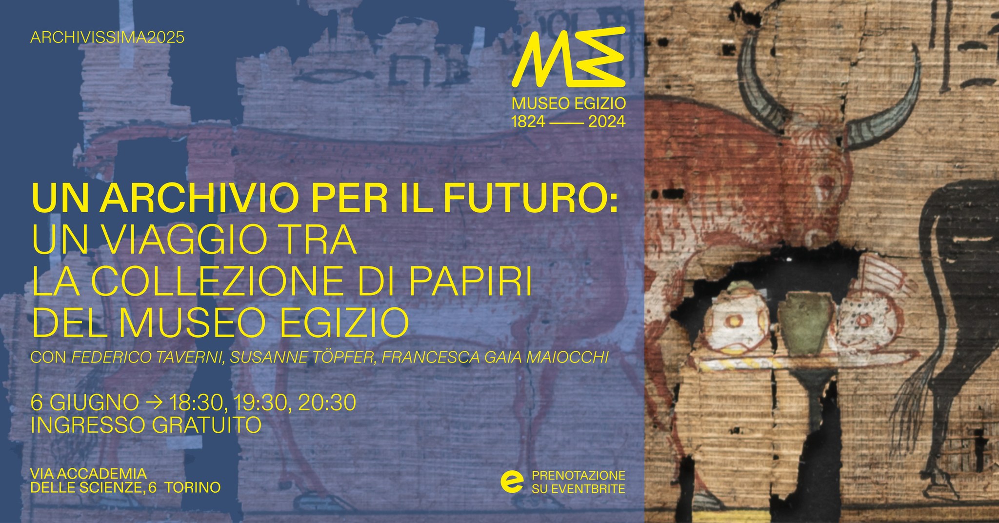 In occasione del Festival “Archivissima” e de “La notte degli Archivi”, il 6 giugno 2025 il museo Egizio di Torino propone “Un archivio per il futuro: un viaggio tra la Collezione di Papiri del museo Egizio”, una serata dedicata alla scoperta della Collezione di Papiri del Museo Egizio, con un focus su alcuni esempi di digitalizzazione 3D ad altissima risoluzione. Il pubblico sarà guidato in un racconto coinvolgente che permetterà di esplorare da vicino alcuni papiri grazie a tecnologie all’avanguardia, capaci di restituire dettagli poco visibili a occhio nudo e offrire nuove prospettive di studio e conoscenza. L’incontro sarà condotto da Federico Taverni, digital media specialist del museo Egizio, con la partecipazione di Susanne Töpfer, responsabile della Collezione di Papiri del Museo, e Francesca Gaia Maiocchi, restauratrice di papiri, museo Egizio. L’evento sarà proposto in 3 repliche: alle 18.30, 19.30 e 20.30. Per ogni fascia oraria, i primi iscritti potranno accedere a una visita esclusiva della Papiroteca, il cuore della conservazione e dello studio dei papiri del museo: saranno contattati direttamente dal museo Egizio che li informerà dell’iscrizione alla visita speciale. Ingresso gratuito con prenotazione obbligatoria su Eventbrite al link https://www.eventbrite.it/…/un-archivio-per-il-futuro…