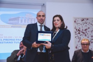 Il segretario della Bmta Ugo Picarelli consegna alla vedova Valeria Li Vigni l premio “Paestum Mario Napoli” assegnato postumo a Sebastiano Tusa durante la XXII Bmta (foto bmta)