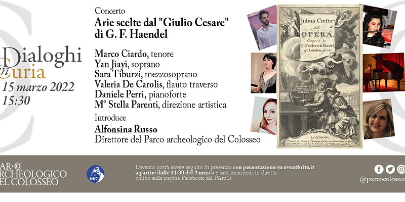 Concerto di arie scelte dal “Giulio Cesare” di G. F. Haendel per le Idi di Marzo 2022. In occasione delle Idi di Marzo, martedì 15 marzo 2022, alle 15.30, la Curia Iulia ospita un concerto dell’ensemble degli allievi del maestro Stella Parenti che eseguiranno arie scelte dal “Giulio Cesare” di G. F. Haendel. Con la partecipazione di Marco Ciardo (tenore), Yan Jiayi (soprano), Sara Tiburzi (mezzosoprano), Valeria De Carolis (flauto traverso) e Daniele Perri (pianoforte). Introduce Alfonsina Russo, direttore del parco archeologico del Colosseo. L’evento potrà essere seguito in presenza con prenotazione su eventbrite.it. Ingresso da largo della Salara Vecchia, 5. All’ingresso del PArCo sarà richiesto di esibire, oltre all’invito, il certificato verde e di indossare la mascherina. L’incontro sarà trasmesso in diretta streaming dalla Curia Iulia sulla pagina Facebook del PArCo: https://www.facebook.com/parcocolosseo.