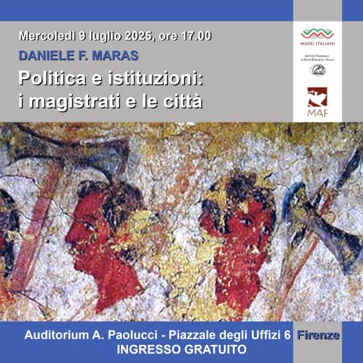 Firenze. All’auditorium Paolucci (Gallerie degli Uffizi) la conferenza “Politica e istituzioni: i magistrati e le città”, con Daniele F. Maras, direttore del museo Archeologico nazionale, quinto appuntamento del ciclo “Gli Etruschi: nuove ricerche, nuove scoperte, nuove storie”