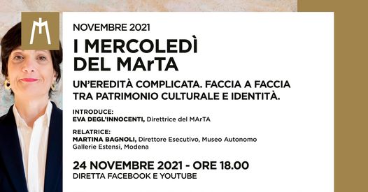 Mercoledì 24 novembre 2021, alle 18, il nuovo appuntamento on line del ciclo i “Mercoledì del MArTA” sarà una occasione di scambio dialettico e di riflessione con Martina Bagnoli, storica dell’arte e dal 2015, dopo prestigiose e importanti esperienze internazionali, direttrice delle Gallerie Estensi. Insieme alla direttrice del museo Archeologico nazionale di Taranto, Eva Degl’Innocenti, parlerà infatti di “Un’eredità complicata. Faccia a faccia tra patrimonio culturale e identità” in diretta sul profilo Facebook e YouTube del MArTA. Le direttrici delle due importanti istituzioni museali sono accomunate dalla visione di patrimonio culturale e dall’idea di museo non solo come luogo di conservazione e tutela, ma anche di dialogo e scambio sociale.