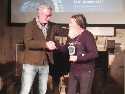Il documentarista Jay Cavallaro consegna il premio Archeovisiva per il miglior film a Donato Laborante, testimonial del film “Pastori nella grotta” (Foto Graziano Tavan)