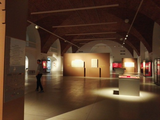 L’allestimento essenziale della mostra “Longobardi. Un popolo che cambia la storia” nella grande sala dell’ex maneggio del Piccolo Ermitage (foto Graziano Tavan)