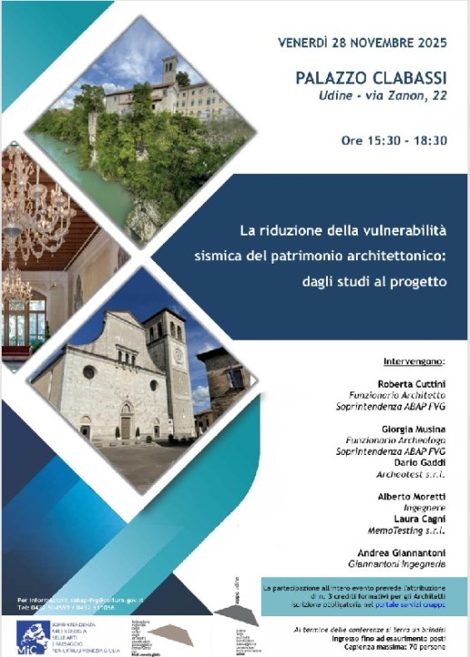 PROGRAMMA. Alle 15.30, dopo i saluti istituzionali gli interventi: Roberta Cuttini, funzionario architetto della soprintendenza ABAP FVG, “Le campagne di ricerche, rilievi e indagini propedeutiche al progetto di riduzione della vulnerabilità sismica del patrimonio architettonico. Nota metodologica e casi studio: Duomo di Santa Maria Assunta e Chiesa di San Martino a Cividale del Friuli”; Giorgia Musina, funzionario archeologo della soprintendenza ABAP FVG, e Dario Gaddi, Archeotest s.r.l., “La lettura archeologica dei dati: Duomo di Santa Maria Assunta e Chiesa di San Martino a Cividale del Friuli”; Alberto Moretti, ingegnere, e Laura Cagni, MemoTesting s.r.l., “Duomo di Santa Maria Assunta in Cividale del Friuli: approfondimento sul percorso di conoscenza dell’edificio e sulla vulnerabilità sismica delle strutture”; Andrea Giannantoni, Giannantoni Ingegneria, “La sicurezza sismica per gli organismi strutturali complessi in muratura storica: nuovi metodi diagnostici e prassi operativa per interventi minimi ed efficaci. Il caso studio della Chiesa di San Martino a Cividale”. Conclusioni. Al termine delle conferenze si terrà un brindisi Ingresso fino ad esaurimento posti. Capienza massima: 70 persone.