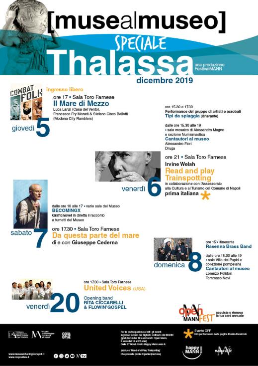 Conclusione dello speciale Thalassa “Muse al Museo”, con un fuori programma tutto natalizio, venerdì 20 dicembre 2019: alle 17.30, nella sala del Toro Farnese, overture con Rita Ceccarelli e Flowin’ Gospel, cui seguirà l’esibizione del coro americano United Voices per salutare l’inizio delle festività. Flowingospel è una Worship Band di Contemporary gospel, con base a Napoli. Il progetto nasce dall’idea di Rita Ciccarelli, (cantante gospel napoletana con esperienza decennale di cori gospel, vincitrice nella categoria Best New Artist 2013 per i Gospel Music Awards of Italy). United Voices è un collettivo di artisti indipendenti degli Stati Uniti nord-orientali. Il coro è composto da artisti di livello internazionale, con oltre 15 anni di esperienza collettiva. Il gruppo è stato fondato da Danton Whitley, molto famoso nel mondo del Gospel americano. La partecipazione agli eventi di “Muse al Museo”, in orario di apertura del Mann, è compresa nel biglietto di ingresso (dalle 17, tariffa Happy Mann 9 euro). Solo per la performance Read and Play Trainspotting con Irvine Welsh (6 dicembre ore 21) è prevista una quota di partecipazione e prenotazione obbligatoria (consultare la pagina evento Facebook).