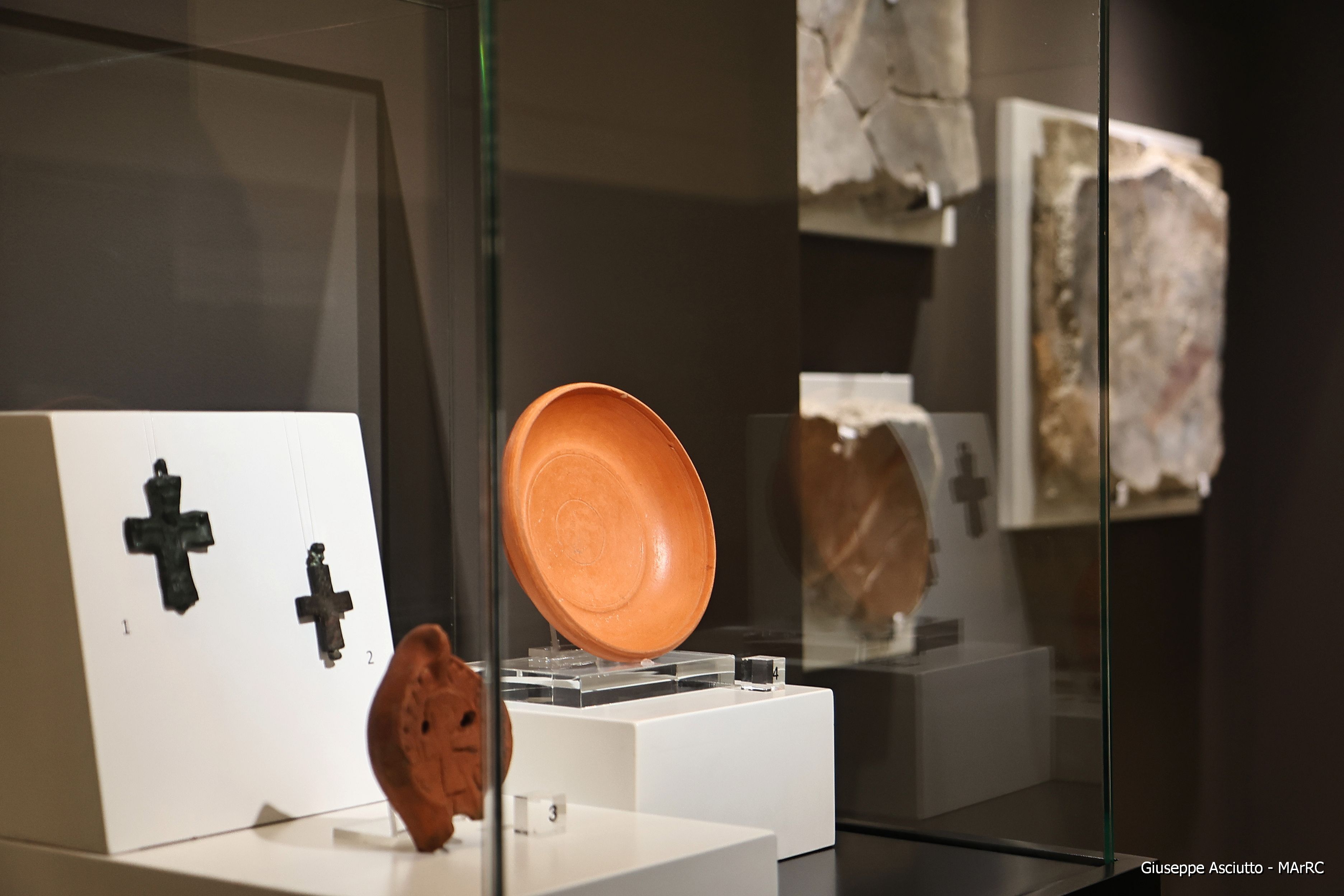Tra i reperti più significativi, la lastra in stucco proveniente dalla chiesa di Santa Maria Theotokos di Terreti (RC), risalente al XI secolo d.C. che torna ad essere esposta dopo più di 15 anni, i frammenti di affresco con figure di pesci dalle Terme Romane di Reggio Calabria, del I-II secolo d.C., nuovamente visibili dopo un accurato intervento di restauro e una statuetta femminile in terracotta, con lunga veste e mantello, proveniente da Rosarno (RC). L’allestimento è arricchito da reperti provenienti dal museo Archeologico nazionale della Siritide di Policoro (Mt), tra cui un’antefissa con volto di Medusa e una Pelike (vaso per contenere liquidi) a figure rosse, entrambe di IV secolo a.C., eccezionalmente esposti a Reggio Calabria come frutto di una sinergica collaborazione tra luoghi e istituti della cultura.