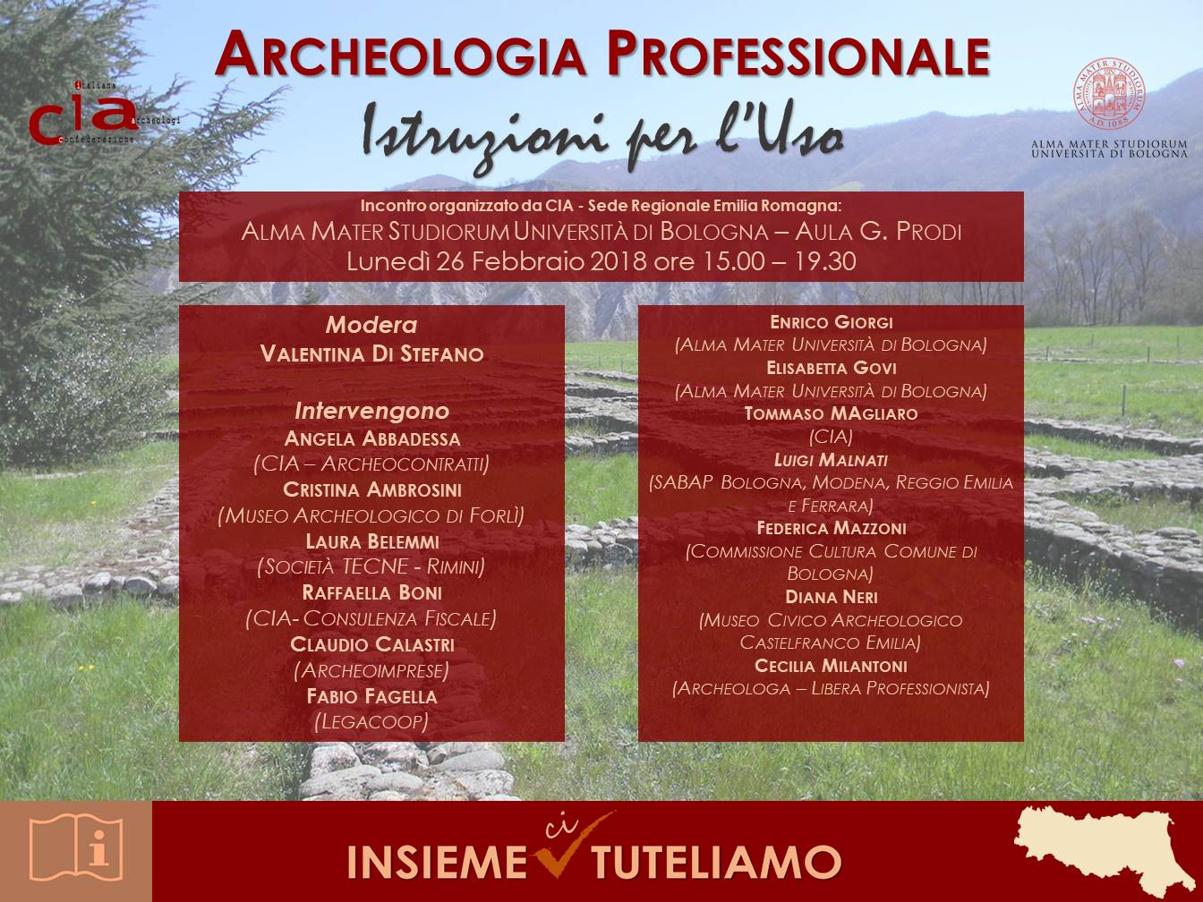 Quali sono le competenze professionali di un archeologo? Quali le attività lavorative oltre allo scavo? Che differenza c’è tra lavoratore dipendente, socio di cooperativa, lavoratore autonomo a partita IVA, ATP e STP? Quali sono le prospettive contrattuali degli archeologi e alle situazioni lavorative in regione? Sono alcuni degli interrogativi cui cercherà di dare una risposta l’incontro “Archeologia Professionale: Istruzioni per l’Uso”, promosso da CIA (Confederazione Italiana Archeologi – Sede Regionale Emilia Romagna) in collaborazione con Alma Mater Studiorum Università di Bologna – Dipartimento di Storia Culture Civiltà, lunedì 26 febbraio 2018, alle 15, in aula Prodi (DiSCi), piazza San Giovanni in Monte 2, a Bologna. Proprio la Confederazione Italiana Archeologi punta con questo incontro a porre le basi per una sede Cia anche in Emilia Romagna che rappresenti e tuteli tutti gli archeologi fornendo assistenza di fronte ai problemi che la professione incontra quotidianamente. Modera l’archeologa Valentina Di Stefano. Aprono i lavori Federica Mazzoni, presidente commissione Cultura nel Comune di Bologna; e Tommaso Magliaro, segretario nazionale Cia. Intervengono su “La legislazione vigente” Luigi Malnati, soprintendente Archeologia Belle arti e Paesaggio della città metropolitana di Bologna e delle province di Modena Reggio Emilia e Ferrara; Angela Abbadessa, Cia-archeocontratti; Raffaella Boni, Cia-consulente fiscale. Su “La formazione possibile” Elisabetta Govi, etruscologa dell’università di Bologna; Enrico Giorgi, metodologie della ricerca archeologica all’università di Bologna. Su “L’esperienza attuale” Cristina Ambrosini, direttore museo Archeologico di Forlì; Diana Neri, direttore museo Archeologico di Castelfranco Emilia; Cecilia Milantoni, archeologa; Laura Belemmi, Tecne (Rimini); Gloria Capelli, Gea (Parma); Claudio Calastri, Archeoimprese; Fabio Fagella, Legacoop. Chiude i lavori una tavola rotonda.