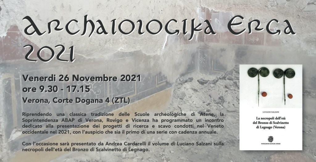 Riprendendo una classica tradizione delle Scuole archeologiche di Atene, e con l’auspicio che sia il primo appuntamento di una serie con cadenza annuale, la soprintendenza Archeologia Belle arti e Paesaggio di Verona Rovigo e Vicenza ha programmato “Archaiologika Erga 2021”, un convegno dedicato alla presentazione degli oltre 20 progetti di ricerca e scavo condotti nel Veneto occidentale nell’anno 2021: appuntamento venerdì 26 novembre 2021, dalle 9.30 alle 17.30, nella sala multimediale di Corte Dogana 4 a Verona. Con l’occasione sarà presentato da Andrea Cardarelli il volume di Luciano Salzani sulla necropoli dell’età del Bronzo di Scalvinetto di Legnago. Ingresso in presenza consentito solo con Green Pass. Si potrà assistere all’evento anche in live streaming sulla Evento Facebook della SABAP-VR all’indirizzo: https://www.facebook.com/events/312881620348219.
