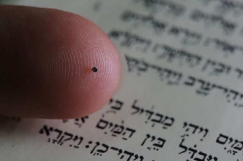 La Nano Bibbia, che sta sulla punta di un dito, è esposta alla mostra “Breve storia dell’umanità” a Gerusalemme