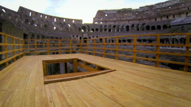 La Coenatio Iovis della Domus Flavia sul Palatino: porzione marmorea orientale avvallata a causa del dissesto statico delle sottostanti suspensurae e continuamente oggetto di interventi di restauro (foto Archivi PArCo)