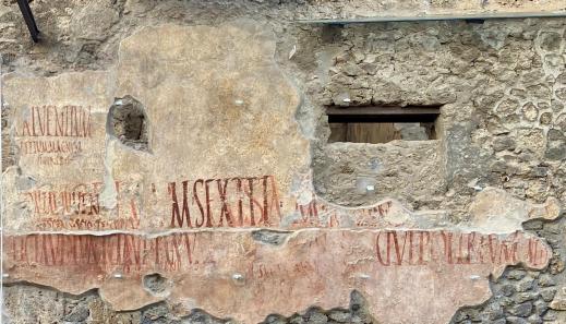 Le scritte elettorali, dopo i restauri, lungo le pareti dell’Insula dei Casti Amanti lungo via dell’Abbondanza a Pompei (foto parco archeologico pompei)