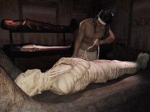 Sulla cassa del sarcofago di Tabekenkhonsu ci sono alcune scene molto interessanti. “Innanzitutto, la rappresentazione della dea dell’Occidente, Hathor, che appare nell’albero sicomoro e versa, quasi facesse una libagione, dell’acqua al defunto che è qui in adorazione. L’albero si trova di fronte alla tomba, la tomba di nuovo resa con la sua facciata, sormontata dalla piramide e la parte alta, la cuspide, il pyramidion in pietra. E questa raffigurazione ci ricorda anche un inno delle tombe tebane in cui sappiamo che i familiari che fanno visita alla tomba vengono invitati a soffermarsi e a sedersi sotto i rami dell’albero sicomoro; e quando sentiranno il frusciare delle foglie non dovranno pensare che quello è il vento ma le anime dei defunti che vengono lì a sedersi. Di nuovo la tomba – sottolinea Greco – è quell’elemento liminale che permette l’incontro tra i viventi e i defunti. E poi al centro è rappresentata una scena importantissima che abbiamo visto nel papiro di Iuefankh: il capitolo 125 del Libro dei Morti. La defunta Tabekenkhonsu in abiti di viventi si trova all’interno di uno spazio architettonico definito. Dietro di lei vi è una divinità femminile con una testa un po’ strana, che per noi però è molto utile perché quella testa resa in quel modo è un geroglifico e di legge “imentet” e quindi è la dea dell’Occidente, Hathor. Tabekenkhonsu assieme alla dea dell’Occidente entra in questo spazio. Davanti a lei c’è il dio Thot, il dio della scrittura, il dio della sapienza, con in mano la paletta scrittoria, che è lì a scrivere. Perché? Perché questa è una versione molto compatta del capitolo 125 del Libro dei Morti. Non vediamo la scena della psicostasia, però sappiamo che siamo di fronte a Osiride che siede in trono seguito dalla dea Iside. E riconosciamo un altro elemento importante: il mostruoso Ammit, il divoratore, che qui è rappresentato con la testa di coccodrillo, la parte anteriore di leone, la parte posteriore di ippopotamo. È lì pronto a divorare il cuore nel caso risultasse più pesante della piuma. Anche se la scena della psicostasia qui non è resa, sappiamo che abbiamo a che fare con questa. C’è un altro elemento importante: la presenza del dio Horus, colui che deve vendicare il padre dopo che era stato ucciso da Seth. E lo vediamo qui con la corona dell’Alto e del Basso Egitto, quindi è colui che adesso ha saldamente il potere sull’Egitto ed è succeduto al padre Osiride”.
