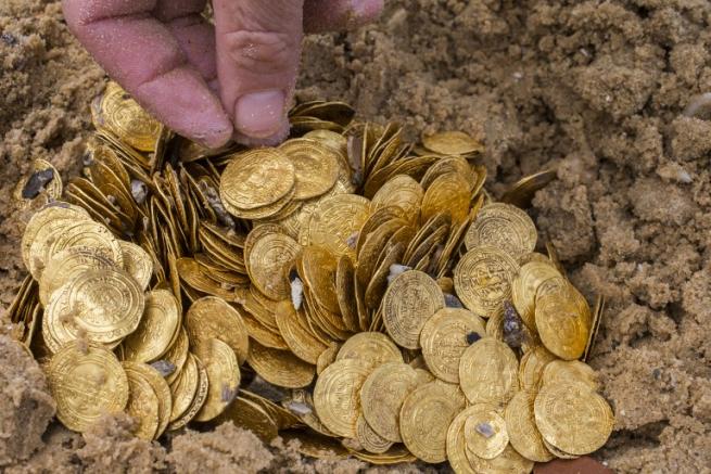 Sei chili di monete d’oro del Califfato dei Fatimidi (X-XII secolo) scoperte sui fondali di Cesarea, in Israele: la nave che le trasportava naufragò quasi mille anni fa