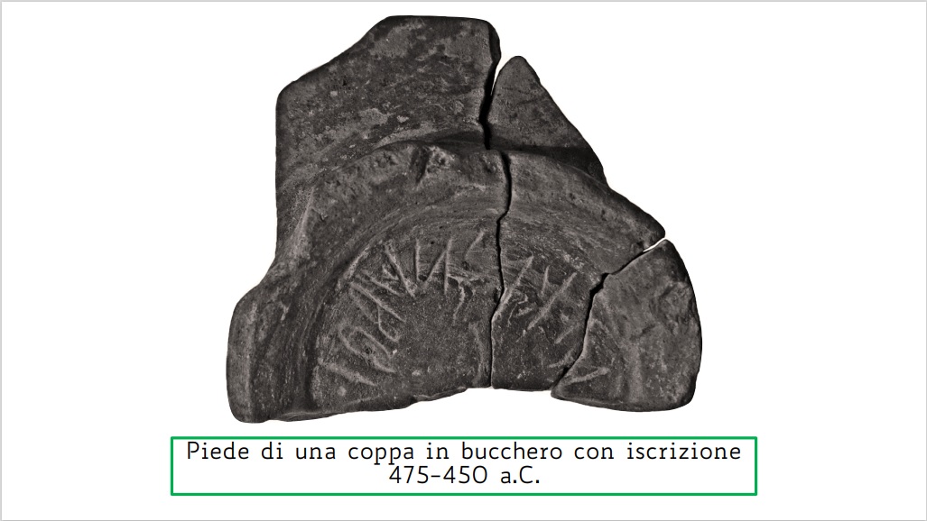 Kainua-Marzabotto: la scrittura e il sacro. Attorno al 500 a.C., nel corso di una riorganizzazione dell’intero territorio etrusco, venne fondata in chiave urbanistica Kainua, su un insediamento arcaico presso la moderna città di Marzabotto. Essendo il primo esteso pianoro per chi giungeva dall’Etruria tirrenica attraversando gli Appennini, la sua posizione risultava strategica per gli intesi traffici commerciali, nei quali rivestiva anche un importante ruolo come centro artigianale. La città si trovava ai piedi di una piccola collina che fungeva da acropoli e si sviluppava secondo assi stradali ortogonali, risultato di un preciso rituale basato su osservazioni astronomiche. Gli edifici sacri dell’Acropoli si collegavano, tramite uno degli assi viari principali, al settore nord-est della città, che era riservato ai templi urbani di Tinia e Uni. Questi edifici sono indice dell’importanza che assumeva la dimensione del sacro all’interno della comunità di Kainua. È proprio dai contesti sacri urbani che giungono le testimonianze epigrafiche più importanti della città. Le iscrizioni rivelano che l’alfabeto traeva origine da quelli dell’Etruria settentrionale e forti erano le influenze di Chiusi nella fase più antica. Nelle iscrizioni santuariali sono attestati il nome dell’antica città e quelli delle principali divinità, che hanno permesso di sapere a chi fossero dedicati i due templi urbani. I supporti privilegiati per la scrittura erano le ceramiche di produzione locale, tra cui in particolare il bucchero. Un caso eccezionale è la lamina di bronzo proveniente dal Tempio di Tinia, sia per il tipo di supporto che per la lunghezza del testo iscritto.