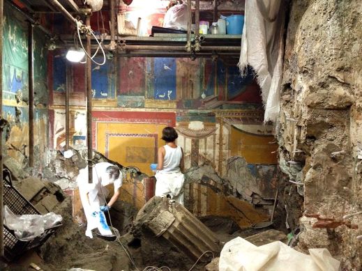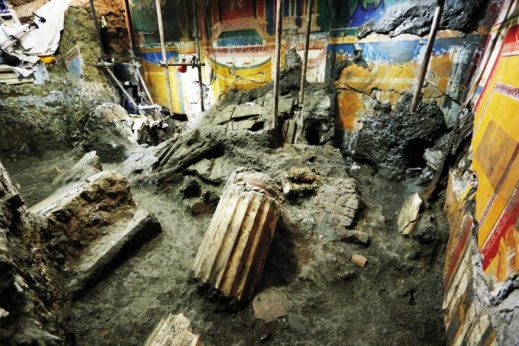 L’eruzione del Vesuvio del 79 d.C. La lussuosa residenza fu danneggiata in modo irreversibile dall’eruzione vesuviana che distrusse Pompei. “La colonna eruttiva – riprende Iannelli – si innalzò nell’atmosfera per oltre venti chilometri, superando l’alta dorsale dei monti Lattari e ricadendo verso sud. Le forti piogge, che sempre si associano alle eruzioni, attivarono valanghe di fango che si ingrossarono verso il fondovalle e si consolidarono rapidamente. I tetti spioventi favorirono lo scivolamento delle pomici verso l’esterno, solo piccoli quantitativi entrarono da porte e finestre. Poco dopo valanghe di fango raggiunsero la villa con una velocità rilevante, riempiendone gli ambienti e facendo crollare, sotto l’enorme spinta, tetti e solai. Le colonne in stucco del portico furono abbattute e trascinate all’interno del triclinio, mentre contro la parete nord si accumulava il materiale ligneo del soffitto, dei tramezzi e delle stesse impalcature dei restauri in corso. Questo accumulo ha protetto i resti di un armadio che conservava il vasellame bronzeo. La parte mediana della parete Est subì uno spostamento di circa quaranta centimetri verso valle, testimoniato da un’ampia frattura, la prova più spettacolare della violenza dell’evento”.