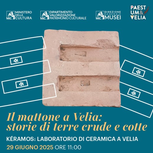 Nuovo appuntamento con i laboratori ceramici “Kéramos” ai parchi archeologici di Paestum e Velia. Domenica 29 giugno 2025, alle 11, nell’area archeologica di Velia, il laboratorio “Il mattone a Velia: storie di terre crude e cotte”. Un’edizione speciale, in collaborazione con l’associazione Pandora Artiste Ceramiste, dedicata alla tradizione costruttiva dell’antica città di Elea-Velia: un’occasione per scoprire, attraverso l’esperienza diretta, le tecniche di fabbricazione dei mattoni velini e il loro valore storico e culturale. La partecipazione al laboratorio è inclusa nel biglietto di ingresso ai Parchi e nell’abbonamento Paestum&Velia. Prenotazione obbligatoria: https://parchipaestumvelia.cultura.gov.it/il-mattone-a-velia-storie-di-terre-crude-e-cotte/