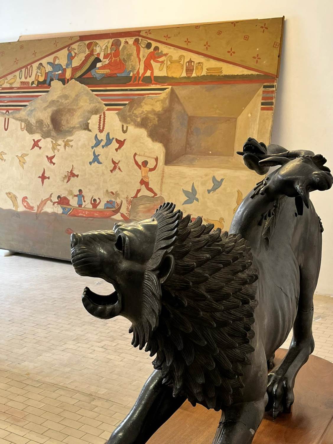L’allestimento completamente ripensato restituisce alla sala la sua unitarietà architettonica e una nuova centralità visiva. Il progetto realizzato dallo studio Guicciardini&Magni, che comprende un sapiente disegno di luci firmato dallo studio Iarussi, e supervisionato dagli architetti Luca Gullì, Luciana Linzalone e Francesca Bacci, della direzione regionale Musei nazionali della Toscana, nasce dall’idea di creare un dialogo continuo tra opera, spazio e luce. Un allestimento ambizioso che fonde rigore museografico e sensibilità progettuale per un nuovo modo di incontrare la Chimera. Tutto parte da un gesto semplice e potente: collocare la Chimera al centro. Da qui si sviluppa un impianto espositivo che guida la fruizione in modo circolare immersivo: la base come fulcro geometrico, la vetrina e la panca come elementi di continuità ed equilibrio, il tendaggio come filtro scenografico che accoglie e accompagna lo sguardo, e infine il restauro dei pavimenti ottocenteschi, decorazioni e impianti, che restituisce alla sala la sua coerenza originaria.