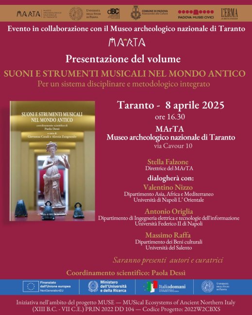 Martedì 8 aprile 2025, alle 16.30, al museo Archeologico nazionale di Taranto, presentazione del libro “Suoni e strumenti musicali nel mondo antico. Per un sistema disciplinare e metodologico integrato” a cura di Giovanna Casali, Alessia Zangrando, Paola Dessì con il coordinamento scientifico di Paola Dessì (L’Erma di Bretschneider). Il libro rappresenta un contributo significativo allo studio della musica antica, offrendo un’analisi interdisciplinare che integra archeologia, musicologia e storia della cultura. Attraverso un approccio metodologico innovativo, gli autori esplorano il ruolo degli strumenti musicali nell’antichità, rivelando come questi non solo producessero suoni, ma fossero anche portatori di significati simbolici e sociali. Intervengono Stella Falzone, direttrice del MArTA; Valentino Nizzo, università di Napoli L’Orientale; Antonio Origlia, università Federico II di Napoli; Massimo Raffa, università del Salento. Saranno presenti le autrici e i curatori del volume.