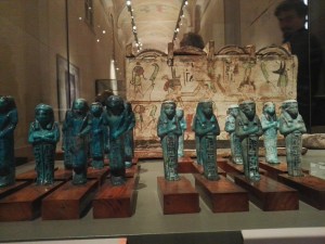 Chiude il percorso della mostra la presentazione dei papiri funerari della ricca collezione Drovetti che, probabilmente, provengono anch’essi dalla necropoli tebana. Questi papiri sono della stessa età dei sarcofagi e riportano i capitoli del Libro dei Morti (una raccolta di formule rituali che consentono al defunto di passare in modo sicuro attraverso il mondo prossimo e unirsi con Osiride e le anime dei beati) e l’Amduat, un importante testo funerario che descrive il viaggio notturno del Sole e la sua vittoria contro tutti i pericoli. Il defunto, identificato con il Sole nel corso di questo viaggio, vince i suoi nemici e diventa immortale come il dio Ra.