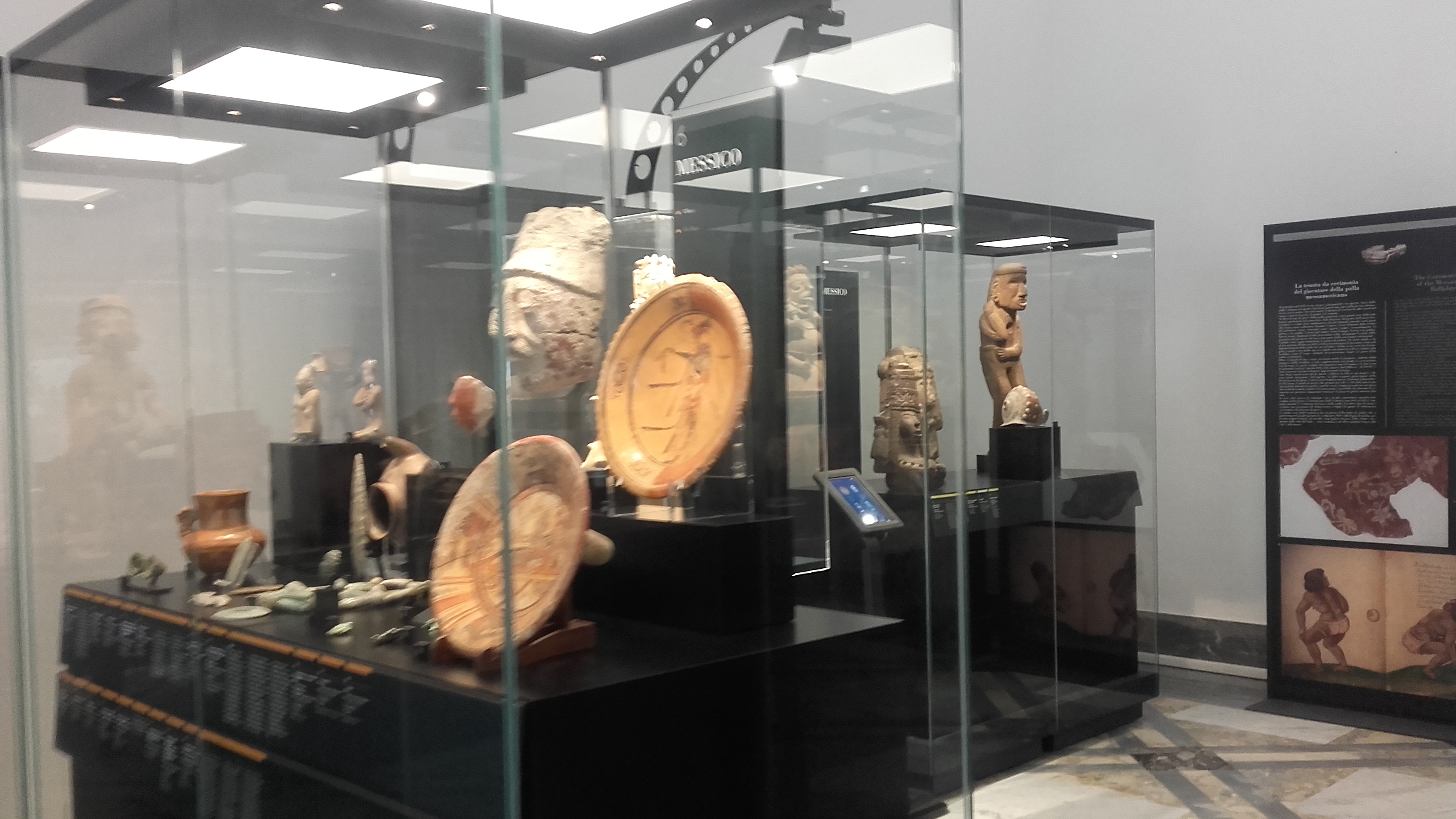 Una delle vetrine della mostra “Il mondo che non c’era” al Mann di Napoli con gli oggetti sul gioco della palla