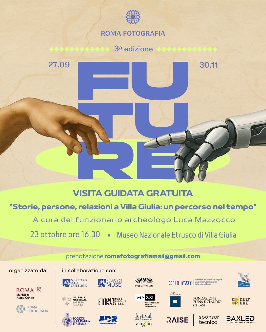 La terza edizione di Roma Fotografia Future, un grande evento culturale diffuso che intreccia arte, innovazione e nuove visioni sul futuro, si svolge a Roma dal 27 settembre al 30 novembre 2025. Realizzato in co-progettazione con il Municipio I Roma Centro, in collaborazione con ADR Aeroporti di Roma, il progetto coinvolge i principali siti e musei della Capitale, trasformandoli in luoghi di dialogo e scoperta. Castel Sant’Angelo, il museo nazionale Etrusco di Villa Giulia, il MAXXI museo nazionale delle Arti del XXI secolo, le Gallerie nazionali di Arte Antica – Palazzo Barberini e Palazzo Merulana sono le sedi nelle quali, sono ospitati i LED PANEL dedicati alla proiezione di contenuti fotografici e video. Realizzati in collaborazione con i nostri partner, hanno l’obiettivo di valorizzare tematiche di interesse condiviso.