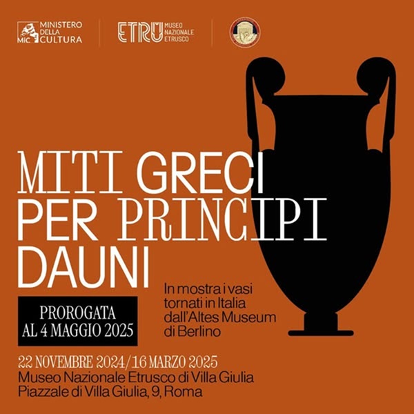 C’è ancora un po’ di tempo per visitare la mostra “Miti greci per principi dauni”, al museo nazionale Etrusco di Villa Giulia, prorogata fino al 4 maggio 2025 (vedi Roma. Al museo nazionale Etrusco di Villa Giulia la mostra “Miti greci per principi dauni”: 25 reperti trafugati, importante gruppo di vasi apuli e attici a figure rosse, recuperati dai Carabinieri del Tpc e provenienti dall’Altes Museum di Berlino. Destinazione finale il costruendo museo della Legalità a Foggia | archeologiavocidalpassato). L’esposizione celebra la restituzione all’Italia di 25 reperti archeologici, un importante gruppo di vasi apuli e attici a figure rosse, recuperati nell’ambito di una complessa operazione di diplomazia culturale condotta con i Carabinieri del Comando Tutela del Patrimonio Culturale e provenienti dalle collezioni di antichità classica dell’Altes Museum di Berlino. Il progetto espositivo, a cura di Luigi La Rocca, Massimo Osanna e Luana Toniolo, nasce nell’ambito dell’Accordo di cooperazione culturale siglato tra i ministeri della Cultura italiano e tedesco, la Fondazione per l’Eredità Culturale della Prussia (SPK) e il Museo di Berlino. Grazie all’intesa è potuto rientrare in Italia un prezioso nucleo di reperti, tra cui straordinari vasi apuli a figure rosse, un cratere lucano e due vasi attici. Ingresso compreso nel biglietto del Museo.
