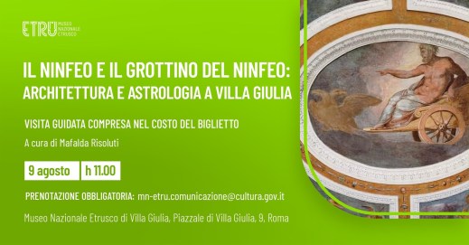 Mentre il sabato mattina, alle 11, c’è IL TRIONFO DELL’ACQUA: IL NINFEO DI VILLA GIULIA, il programma di itinerari pensati per scoprire il luogo più delicato della villa, a pochi mesi dal suo incredibile restauro. Dalla monumentalità delle statue al significato più profondo dell’acqua, passando per la ricchezza degli affreschi della sala dello Zodiaco, in un percorso di stupore e meraviglia. Per partecipare alle visite guidate occorre prenotarsi all’indirizzo mn-etru.comunicazione@cultura.gov.it indicando il giorno e il numero di partecipanti. Sarà possibile prenotarsi direttamente all’accoglienza del Museo, salvo disponibilità. Si inizia il 2 agosto 2025, “Acqua passata e presente: il Ninfeo di Villa Giulia”, a cura di Simone Lucciola; 9 agosto 2025, “Il Ninfeo e il grottino del Ninfeo: architettura e astrologia a Villa Giulia”, a cura di Mafalda Risoluti; 23 agosto 2025, “Il trionfo dell’acqua: il Ninfeo di Villa Giulia”, a cura di Luigi Corbelli; 30 agosto 2025, “Sotto il cielo di Villa Giulia: giochi di acque e di stelle”, a cura di Mariacristina Masci.