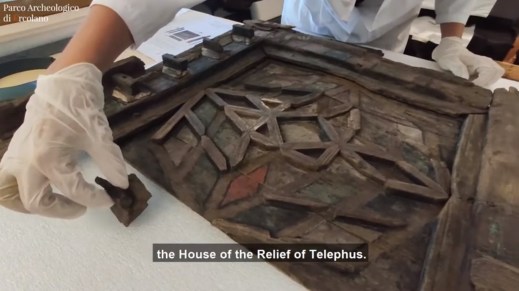 Oltre ai mobili a Ercolano sono stati ritrovati anche complementi di arredo. Eccezionali durante gli scavi effettuati in collaborazione con l’Herculaneum Conservation Project e con il finanziamento della fondazione Packard sono i resti di un soffitto che decorava il salone delle feste della Casa del Rilievo di Telefo. “Il legno in questo caso – continua Sirano – ha mantenuto il suo aspetto di legno vivo perché è stato ritrovato in un ambiente umido. Ma non solo: si può vedere come si sono conservati i colori. E inoltre è stato particolarmente interessante l’aver potuto ricostruire la tecnica degli incastri che venivano utilizzati da questi sapientissimi artigiani che hanno creato un vero e proprio capolavoro nella casa di Marco Nonio Balbo che era uno dei personaggi più importanti di Ercolano antica”. Elisabetta Canna, restauratore del parco archeologico di Ercolano: “Il restauro di questo reperto, come degli altri 75 pezzi del soffitto della Casa del Rilievo di Telefo, è iniziato molti anni fa, perché la fase preliminare all’intervento è stata una fase di studio e ricerca, proprio perché il legno bagnato e ritrovato a Ercolano è di estrema rarità. Conclusa la fase di studio nella quale si è indagata anche la natura del legno, ed è venuto fuori essere un abete bianco, e la natura dei colori delle ocre stese con un legante organico, una proteina, una tempera all’uovo, si è potuto mettere a punto un intervento di conservazione, un consolidamento con degli zuccheri, elementi compatibili con il materiale originale. E poi una seconda fase di restauro estetico della superficie che ha visto l’utilizzo del laser come elemento fondamentale per recuperare le cromie originali dal materiale di scavo che era rimasto incrostato sulle superfici”.