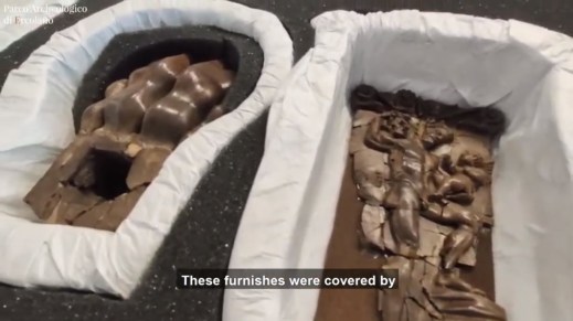 Tra gli oggetti più sbalorditivi ritrovati nel corso degli scavi alla villa dei Papiri da Maria Paola Guidobaldi ci sono dei mobili di legno. Le analisi hanno rivelato che si tratta di legno di frassino e questi mobili erano rivestiti con placche di avorio in parte lavorate a rilievo. Durante la documentazione preliminare sono stati effettuati una serie di disegni accurati e un modello 3D che ha permesso di recuperare una copia perfettamente uguale all’originale stampata con laser scanner in maniera da poter manipolare facilmente questi pezzi che altrimenti non avremmo potuto toccare data la delicatezza. “In questa maniera si è cercato di ricostruire gli assemblaggi delle varie parti che formavano questo mobile. Si può vedere l’incastro sulla zampa leonina che era la base di un mobile che oggi sappiamo essere identificato con il sostegno di un bacino, un sostegno a treppiedi, un tripode che aveva in alto un coronamento al di sopra del quale dobbiamo immaginare un bacino. Sulla base del numero di frammenti si sono ipotizzati almeno tre tripodi, tre vasi di sostegno che in base alla decorazione dovevano avere un significato anche rituale. Infatti notiamo che tutto gira intorno al mondo di Dioniso: si riconosce il dio e personaggi del suo corteggio. Ed eccezionali sono le scene di sacrificio che avvengono sui pezzi che sostenevano il vero e proprio bacino. Qui infatti abbiamo una scena dove si vedono proprio delle persone che stanno compiendo un sacrificio incruento davanti a una statua del dio Priapo”.