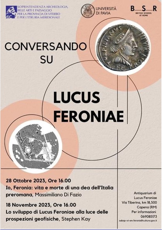 Nell’ambito del ciclo di conferenze dal titolo “Conversando su Lucus Feroniae”, si terrà sabato 28 ottobre 2023, alle 16.00, un incontro dedicato all’approfondimento del culto della dea Feronia. Appuntamento all’antiquarium dell’area archeologica di Lucus Feroniae a Capena (Rm) con la conferenza di Massimiliano Di Fazio “Io, Feronia: vita e morte di una dea dell’Italia preromana”. L’ intervento di Massimiliano Di Fazio si inserisce in una serie di studi dedicati alle religioni e alle divinità dell’Italia antica, a cavallo tra preromano e romano. Proprio alla dea Feronia, l’autore Massimiliano Di Fazio docente di Archeologia dell’Italia preromana all’università di Pavia, ha dedicato una monografia e delle ricerche, che verranno presentati e discussi con il pubblico. Un secondo appuntamento è in programma per sabato 18 novembre 2023, sempre alle 16, nel corso del quale Stephen Kay (British School at Rome) illustrerà al pubblico i risultati di indagini geofisiche svolte nell’area archeologica in anni recenti.