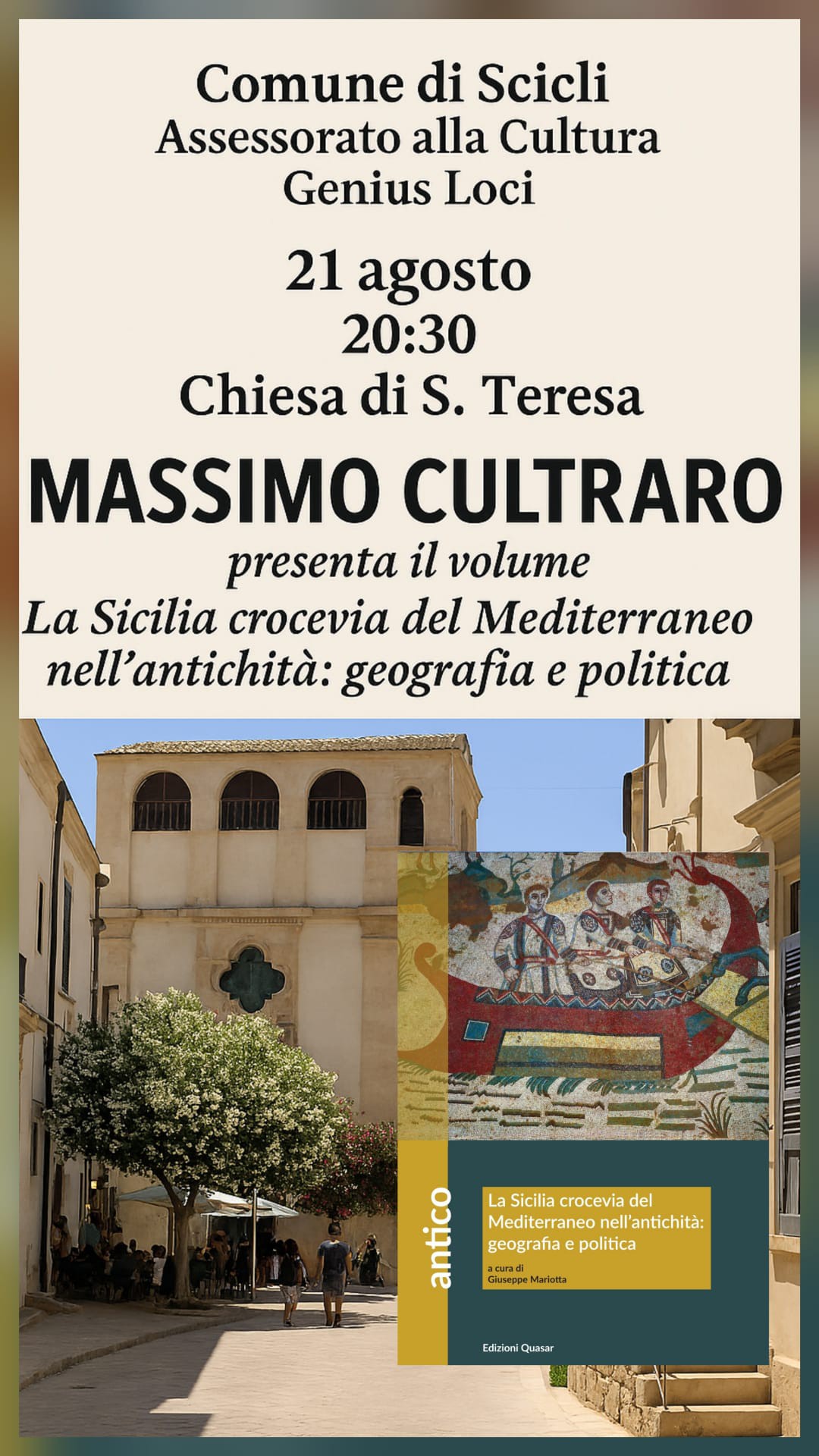 A meno di due anni dal convegno “La Sicilia crocevia del Mediterraneo nell’antichità: geografia e politica” tenutosi a Scicli (Rg) il 13-14 ottobre 2023, proprio Scicli, giovedì 21 agosto 2025, nella chiesa di Santa Teresa, ospita, alle 20.30, la presentazione degli Atti a cura di Giuseppe Mariotta (Quasar edizioni). Massimo Cultraro, Cnr-Ispc, parlerà con l’autore Giuseppe Mariotta, storico dell’antichità e assessore alla Cultura, della Sicilia nelle sue millenarie e articolate trame mediterranee. “Il convegno, di cui qui si pubblicano gli Atti”, scrive Mariotta nella Premessa, “ha affrontato una problematica della massima importanza per la storia antica, ma sempre attuale, ossia il ruolo della Sicilia come crocevia del Mediterraneo, luogo di contatto e interazione tra culture e civiltà. A questa indagine hanno contribuito specialisti di varie discipline, tra cui storia, archeologia e filologia, utilizzando approcci e strumenti diversificati. Il periodo analizzato si estende dalla preistoria alla tarda antichità, con incursioni nelle epoche successive fino a quella contemporanea”.