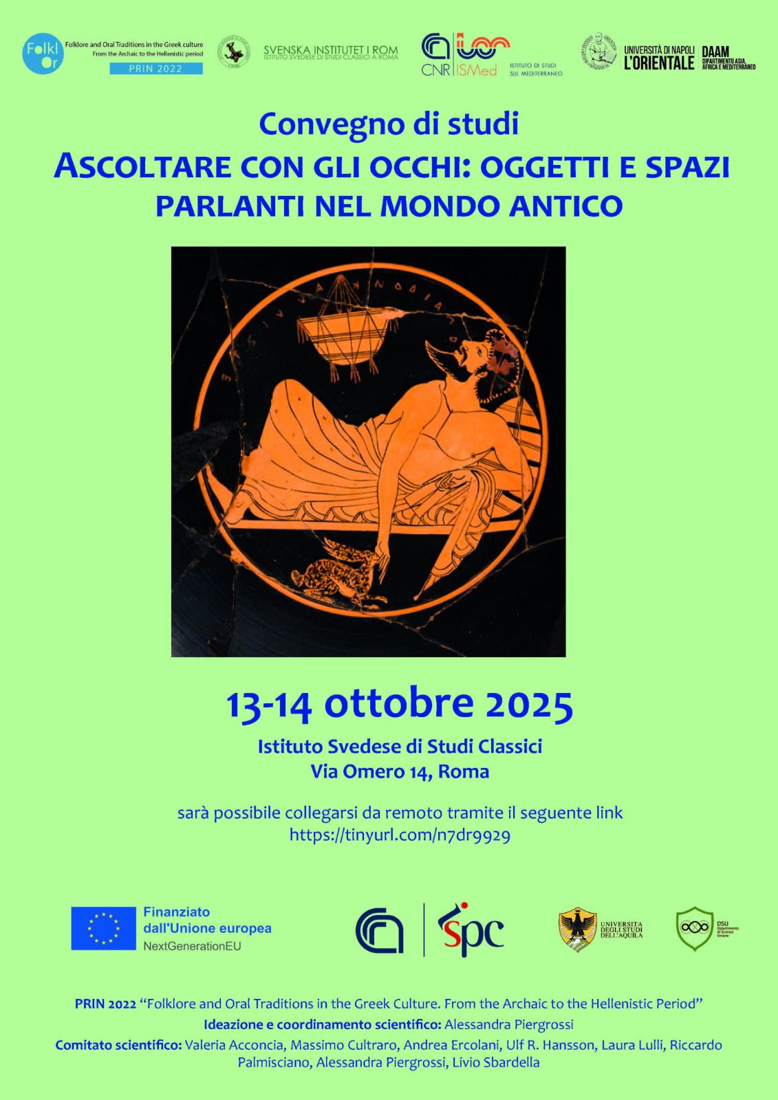 PROGRAMMA GIOVEDÌ 30 OTTOBRE 2025. Alle 9.30, registrazione dei partecipanti. 1. COMUNICAZIONI ORALI Alle 10, Christian METTA, “Dentro la terra: la presenza umana nelle grotte dell’Italia centrale tirrenica tra IV e II millennio a.C.”; 10.20, Donata LUISELLI, Felice LAROCCA, Emma PRANTONI, Francesco FONTANI, Adriana LATORRE, Alexia MAZZINI, Chantal MILANI, Martina Jirina ORSONI, Mattia ROSSI, Mirko TRAVERSARI, Gianandrea PASQUINELLI, Paola IACUMIN, Elisabetta CILLI, “Un’ulna paleolitica da Grotta della Monaca (Sant’Agata di Esaro, Cs). Restauro virtuale, analisi molecolari e isotopiche”; 10.40, Lucia SARTI, Fabio MARTINI, “Grotta del Cavallo (Lecce) e l’uso dello spazio di grotta nel Paleolitico”; 11, Alessia FUSCONE, Tommaso SANTAGATA, Norma DAMIANO, Antonio SALERNO, “La Grotta dell’Ausino (Castelcivita, Salerno). Una nuova documentazione topografica con metodi 3D e una rilettura del contesto archeo speleologico”; 11.20, Coffee break; 11.50, Domenico LO VETRO, “Nuove indagini a Grotta delle Veneri di Parabita (Le): ricerca interdisciplinare e valorizzazione”; 12.10, Tommaso SANTAGATA, Umberto DEL VECCHIO, Tullio BERNABEI, Luca IMPERIO, Francesco SAURO, “Il “Progetto Kronio”: dalle prime esplorazioni al rilievo tridimensionale delle Stufe di San Calogero (Monte Kronio, Ag)”; 12.30, Maria Teresa CUDA, Chiara DE MARCO, Fabio MARTINI, Lucia SARTI, Nicoletta VOLANTE, “Le “grotte” del Monte Cetona (Siena). Spazi sacri e spazi quotidiani tra Paleolitico ed età del Bronzo finale”; 12.50, Rossella VENEZIANO, Enrico LUCCI, “Dal contesto alle reti di connettività: il complesso vascolare eneolitico di Grotta della Monaca (Sant’Agata di Esaro, Cs)”; 13.20, Pausa pranzo; 15, Antonino FILIPPI, “L’arte rupestre preistorica e dell’antichità nelle grotte della Sicilia nord-occidentale: un aggiornamento”; 15.20, Antonella MINELLI, “Il Molise preistorico in grotta: storia delle ricerche e nuovi contributi 15:40-16:00 – 24. Angelica FERRACCI, Elia MARIANO, Angelo PROCACCIANTI, Mario Federico ROLFO, “Grotte, uomini e dei: la speleoarcheologia del Lazio”; 16, Alessio FABBRICATORE, Donatella CERGNA, “Il Brotlaibidol della Grotta Gigante a Trieste e le asce in pietra verde delle grotte del Carso classico”; 16.20, Angelo VINTALORO, Giampiero MUSSO, “Esplorazione inedita nell’Alto Belice Corleonese: le grotte preistoriche nella Riserva di Monte Genuardo nei Comuni di Bisacquino, Campofiorito, Chiusa Sclafani e Giuliana”; 16.40, Lucia SARTI, Fabio MARTINI, Chiara DE MARCO, Pier Francesco FABBRI, Pasquino PALLECCHI, “Il “Progetto Parrano”. Ricerca e valorizzazione di un sito in relazione alla preistoria dell’Italia centrale”; 17, Coffee break. 2. POSTER Alle 17.30, Luca CUSIMANO, Angelica FERRACCI, Mario Federico ROLFO, “Nuovi rilievi fotogrammetrici presso il sito neandertaliano di Grotta Guattari (San Felice Circeo, Lt)”; 17.40, Rossella VENEZIANO, Felice LAROCCA, “Il complesso vascolare della tarda età del Bronzo della Grotta du’ Scuru (Amantea, Cs)”; 17.50, Marianna COLTELLI, Luca PISANI, Valeria MIELE, “Le grotte delle Gole del Sagittario (L’Aquila): nuove indagini speleologiche e archeologiche”; 18, Delia CARLONI, Felice LAROCCA, Antonella MINELLI, Giuseppe DE LUCA, Giuseppe Egidio DE BENEDETTO, “Residui organici dalle ceramiche delle grotte della Pietra Sant’Angelo a San Lorenzo Bellizzi. Analisi preliminari di vasi dalla Grotta del Conoide e dalla Grotta del Banco di Ferro”; 18.10, Christian METTA, “Un contesto rupestre tra preistoria e storia: indagini archeologiche nella Grotta del Paternale (Ischia di Castro, Vt)”; 18.20, Delia CARLONI, Felice LAROCCA, Ilaria DE MARCO, Rossella VENEZIANO, “Archeologia delle grotte del “Muraglione” a Cassano allo Ionio (Cs): storia degli studi e prospettive di ricerca”. A seguire, discussione generale su comunicazioni e poster presentati nel corso della giornata, quindi chiusura dei lavori.