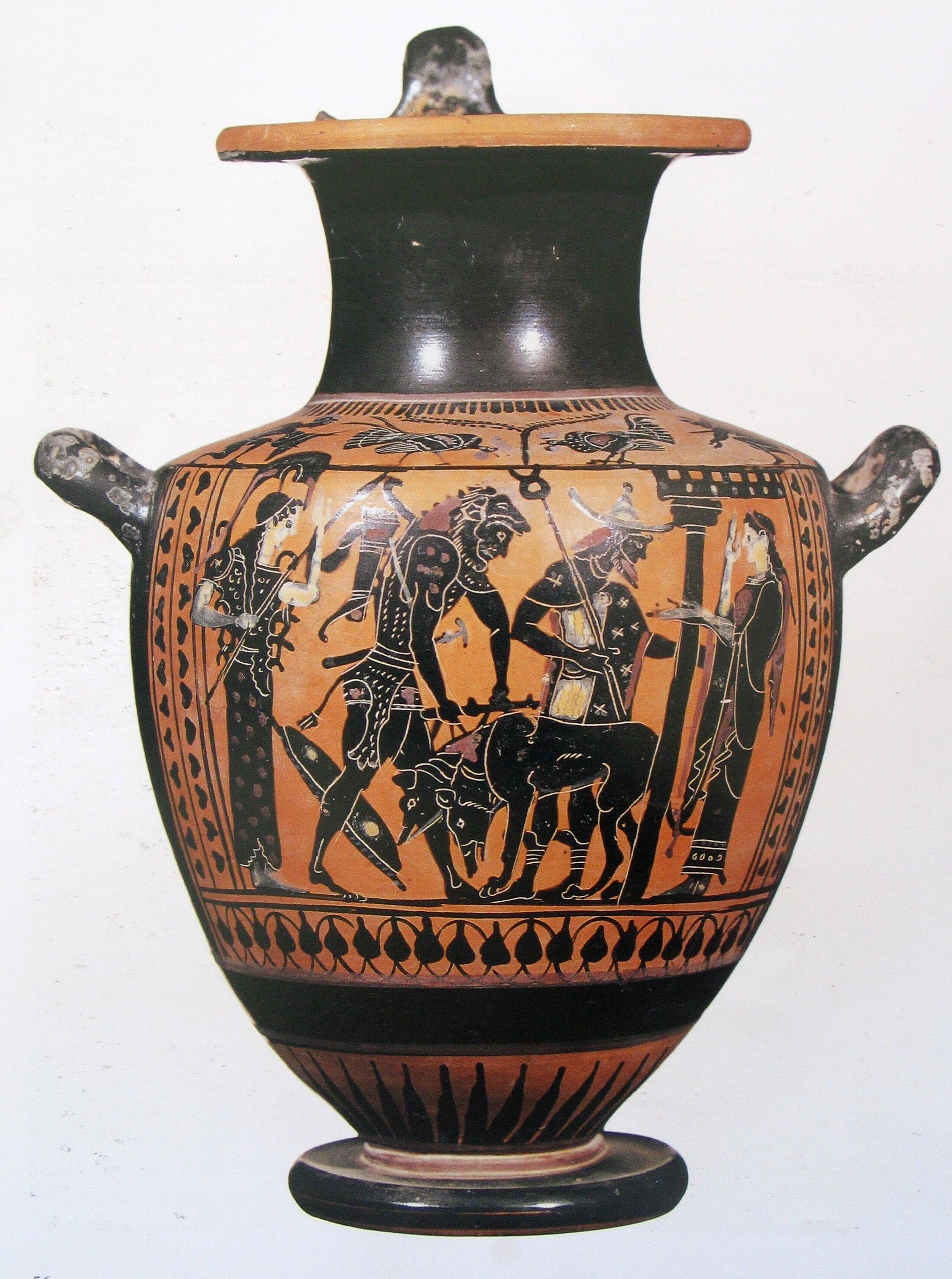 Hydria a figure nere (VI sec. a .C.), attribuita al pittore di Edimburgo, con Eracle e Cerbero (foto Mann)