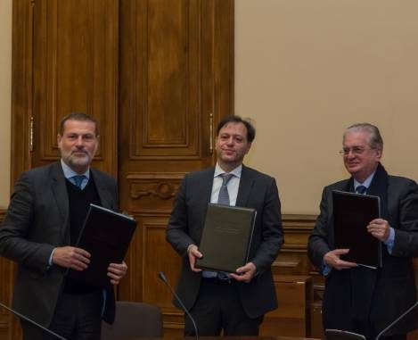 I firmatari del protocollo di San Pietroburgo: da sinistra, Massimo Osanna (Pompei), Paolo Giulierini (Mann), Michail Piotrovskij (Ermitage)