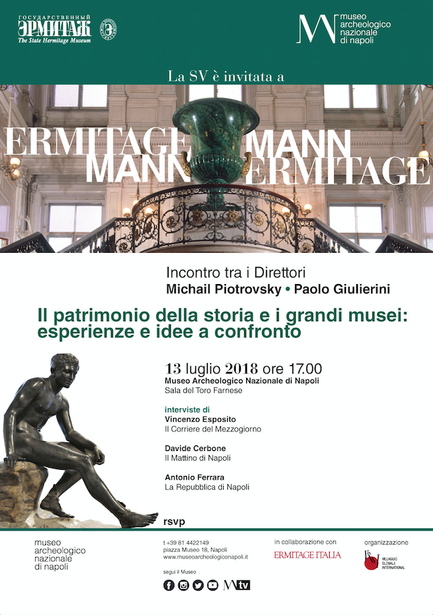 Due mesi fa, era l’inizio di maggio 2018, l’inaugurazione della mostra “Longobardi. Un popolo che cambia la storia” al museo statale dell’Ermitage di San Pietroburgo è stato il sigillo – se ancora ce ne fosse stato bisogno – su una collaborazione scientifica e operativa tra il museo Archeologico nazionale di Napoli e la prestigiosa istituzione culturale russa che sta dando ottimi frutti. E che venerdì 13 luglio 2018, alle 17, al museo Archeologico nazionale di Napoli, vedrà una nuova tappa significativa: nella Sala del Toro Farnese si svolgerà infatti l’incontro tra Michail Piotrovsky, direttore del museo statale Ermitage di San Pietroburgo e Paolo Giulierini, direttore del Mann, che si confronteranno in una conferenza aperta al pubblico su “Il patrimonio della storia e i grandi musei: esperienze e idee a confronto”, intervistati da Vincenzo Esposito (Il Corriere del Mezzogiorno), Davide Cerbone (Il Mattino di Napoli) ed Antonio Ferrara (La Repubblica di Napoli).