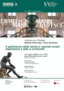 E ora l’importante e attesa visita ufficiale al Mann di Napoli e al suo direttore Paolo Giulierini, da parte di Michail Piotrovsky, direttore generale del museo Statale Ermitage – che sarà a Napoli venerdì 13 luglio 2018, accompagnato da Irina Artemieva conservatrice del dipartimento di Pittura veneta del museo russo e direttrice di Ermitage Italia –, con la conferenza-confronto pubblico tra i due direttori: “ERMITAGE/MANN – MANN/ERMITAGE. Il patrimonio della storia e i grandi musei: esperienze e idee a confronto”. Un’occasione tra due protagonisti della cultura russa e italiana per parlare di patrimoni d’arte e storia e di grandi musei, di ruolo delle istituzioni museali nella società attuale e strategie future, ma anche di collaborazioni internazionali e grandi eventi. Una conferma dell’importante relazione che lega da oltre un anno i due Musei e un riconoscimento del valore del Mann e delle sue collezioni a livello internazionale, grazie al lavoro di apertura e valorizzazione attuato dalla direzione dell’Istituzione napoletana. Straordinari sono del resto i progetti ai quali stanno lavorando congiuntamente i musei russo e italiano e che porteranno, come prossima tappa, a due grandi esposizioni nel marzo del 2019: la prima grande mostra mai dedicata al sommo Canova e ai suoi rapporti con l’antico, in quello che è un vero e proprio tempio dell’arte classica – un’antologica emozionante per prestiti e studi -, e una grande mostra all’Ermitage dedicata a Pompei, insieme alla Soprintendenza Pompei.