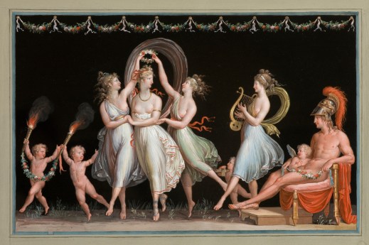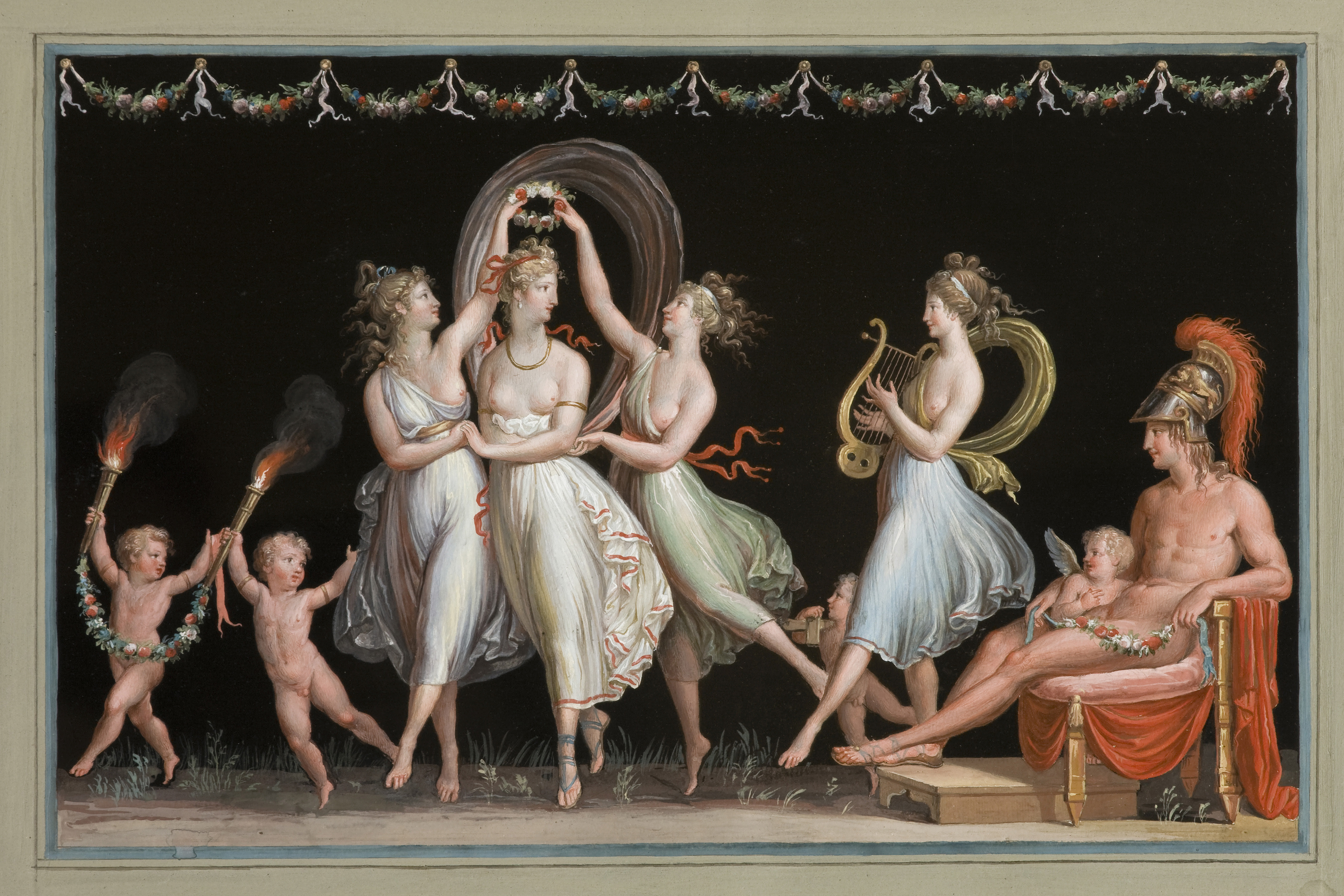 Fondamentale in tal senso anche il supporto della soprintendenza ABAP dell’area metropolitana di Venezia e delle province di Belluno, Padova e Treviso, che in questi anni sta conducendo una delicata azione sul territorio, non solo di tutela delle opere d’arte, ma anche di salvaguardia e affermazione del loro valore testimoniale rispetto alle drammatiche vicende della prima Guerra Mondiale, che le ha viste tragicamente protagoniste, talvolta riportando ferite di cui va mantenuta viva la memoria. Sempre nell’ambito della collaborazione con l’Istituzione di Possagno, altro elemento peculiare della mostra sarà la possibilità di ammirare tutte insieme e dopo un attento restauro, le 34 tempere su carta a fondo nero conservate nella casa natale dell’artista: quei “varj pensieri di danze e scherzi di Ninfe con amori, di Muse e Filosofi ecc, disegnati per solo studio e diletto dell’Artista”, come si legge nel catalogo delle opere canoviane steso nel 1816, chiaramente ispirati alle pitture pompeiane su fondo unito e, in particolare, alle Danzatrici. Con le tempere, lo scultore del bianchissimo marmo di Carrara sperimentava, sulla scia di quegli esempi antichi, il suo contrario, i “campi neri”, intendendo porsi come redivivo pittore delle raffinatezze pompeiane ammirate in tutta Europa, alle quali, per la prima volta, quei suoi “pensieri” possono ora essere affiancati.